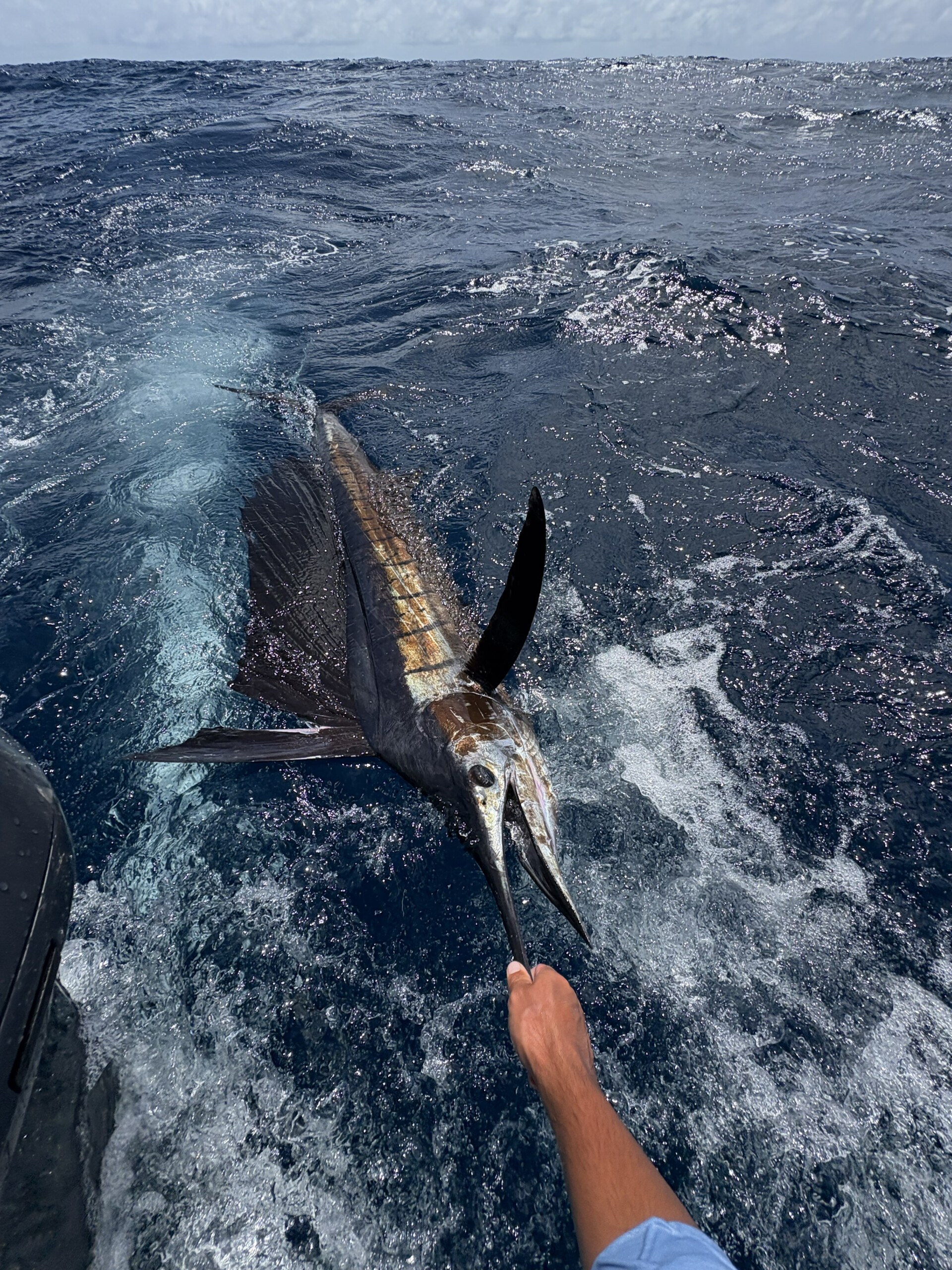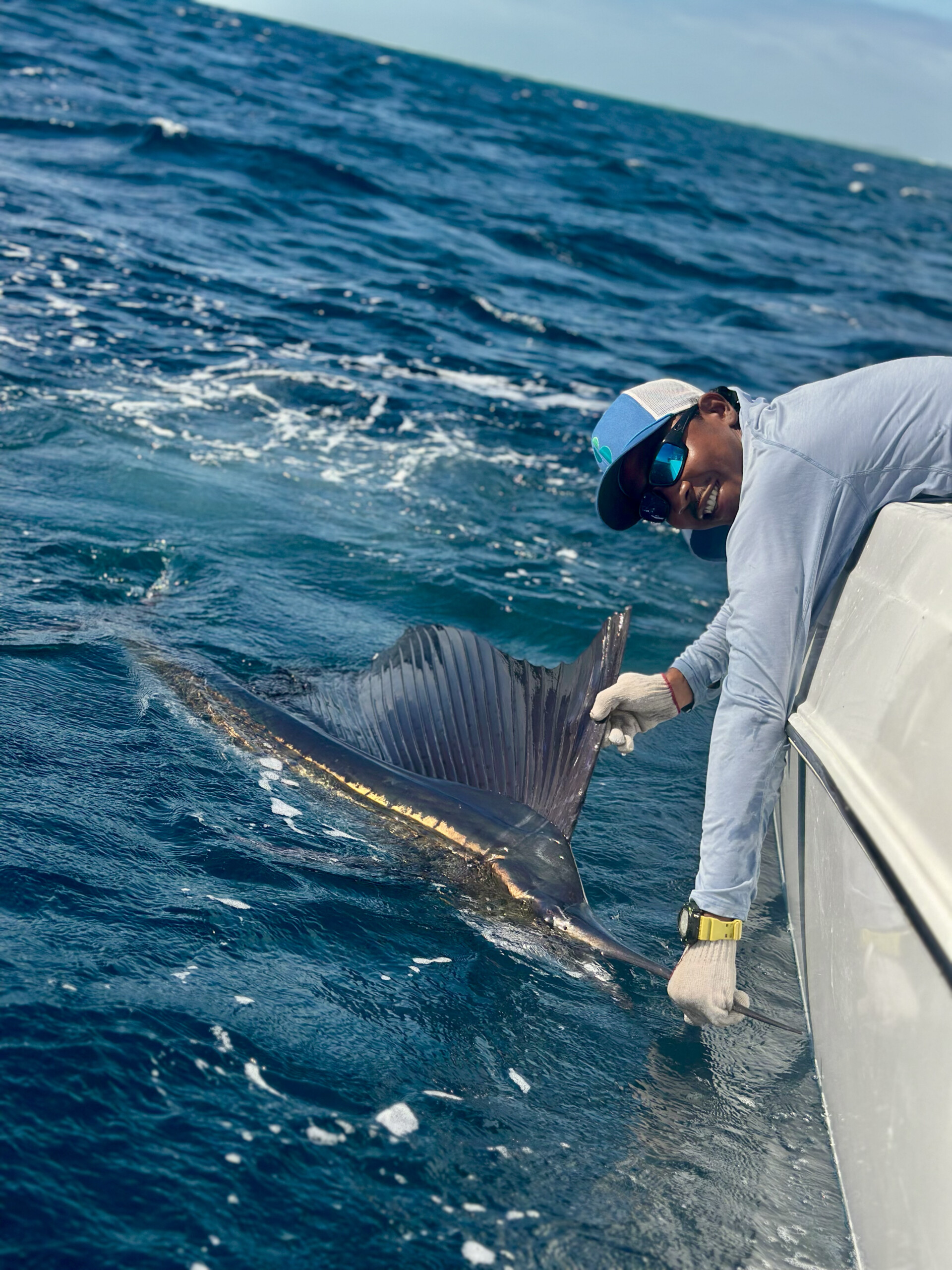 While the flats required persistence, the deep blue delivered spectacular rewards. An influx of baitfish around the atolls drew in impressive numbers of sailfish, tuna, and wahoo, sparking immediate excitement among the anglers. One morning, a family of five boarded Suli to try their luck at bluewater fishing and all five landed their first sailfish on fly, a milestone few families could ever claim. Many other guests followed suit, each returning with stories of their first billfish and some pushing further to land multiple sails in a single session. Jay, having watched the action unfold for days, headed to the bluewater and in one remarkable session landed six sailfish on fly, a feat he will remember for years. Soon after, seven more guests landed their first sailfish — with a few even hooking their first wahoo in the chaos.