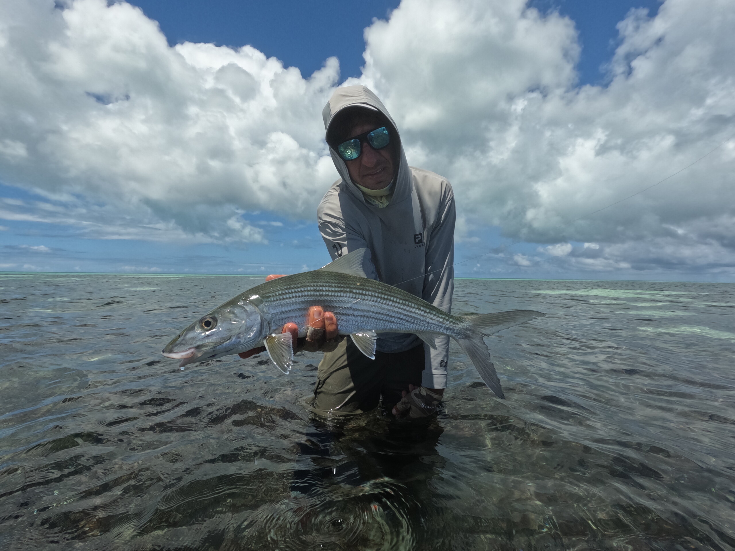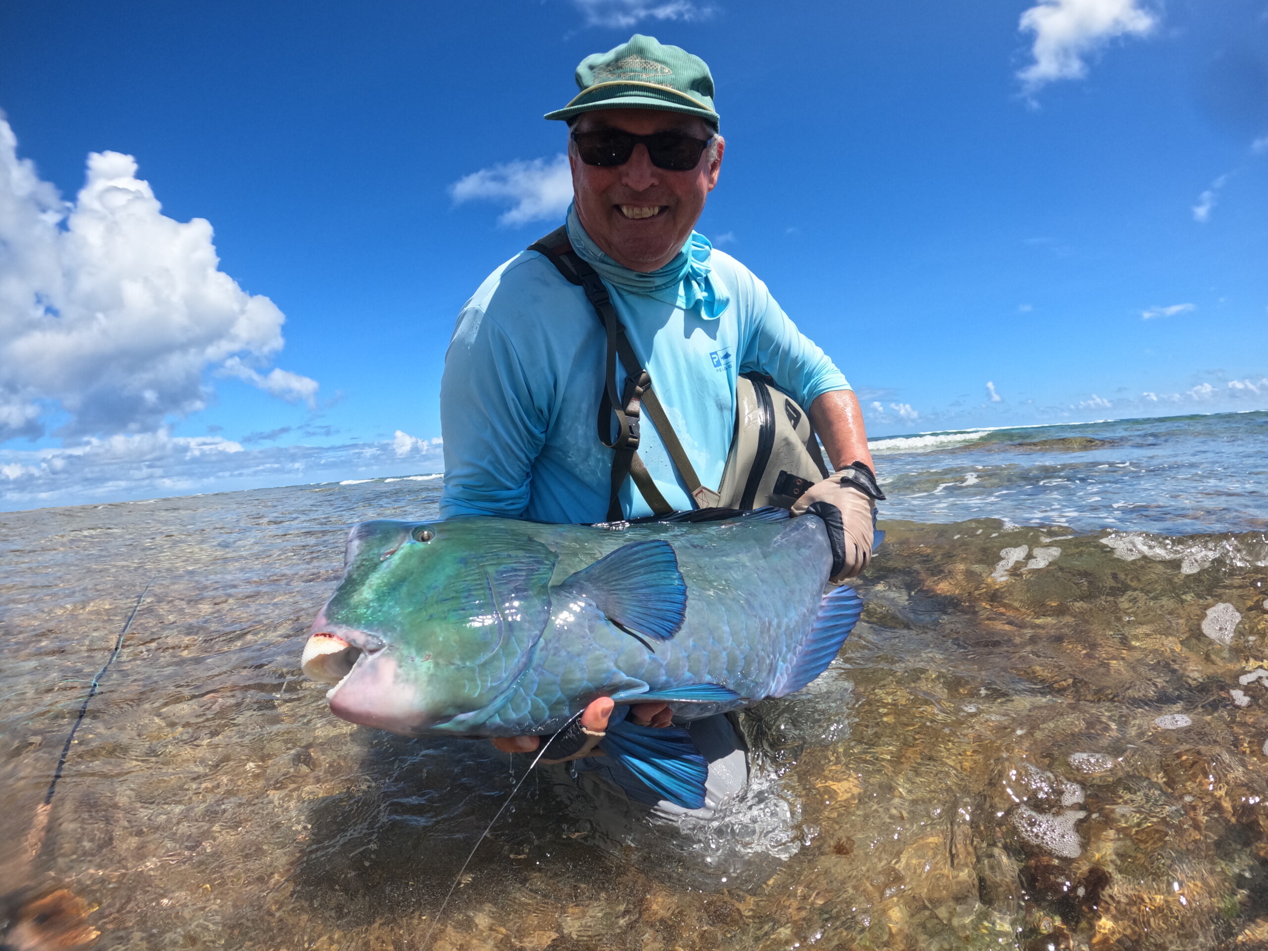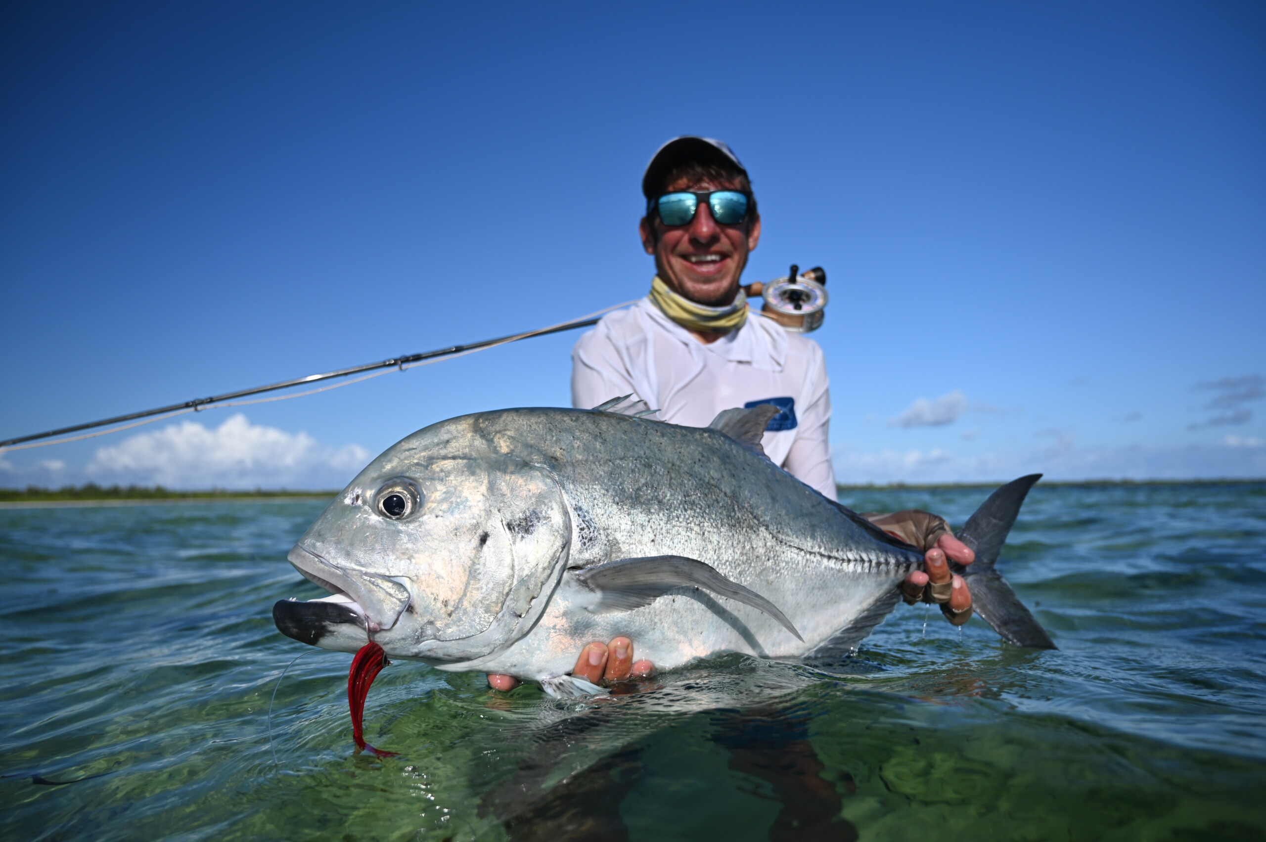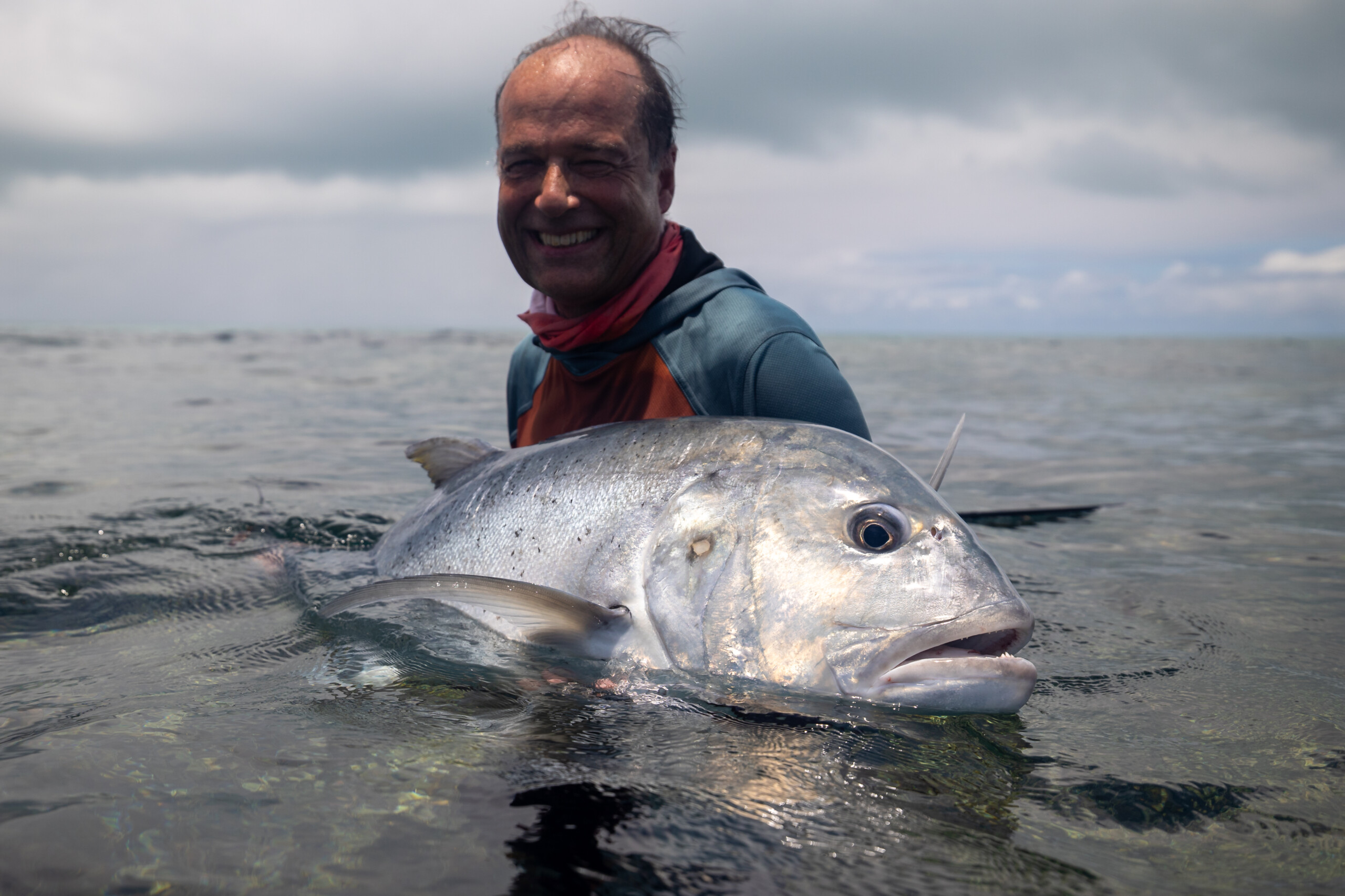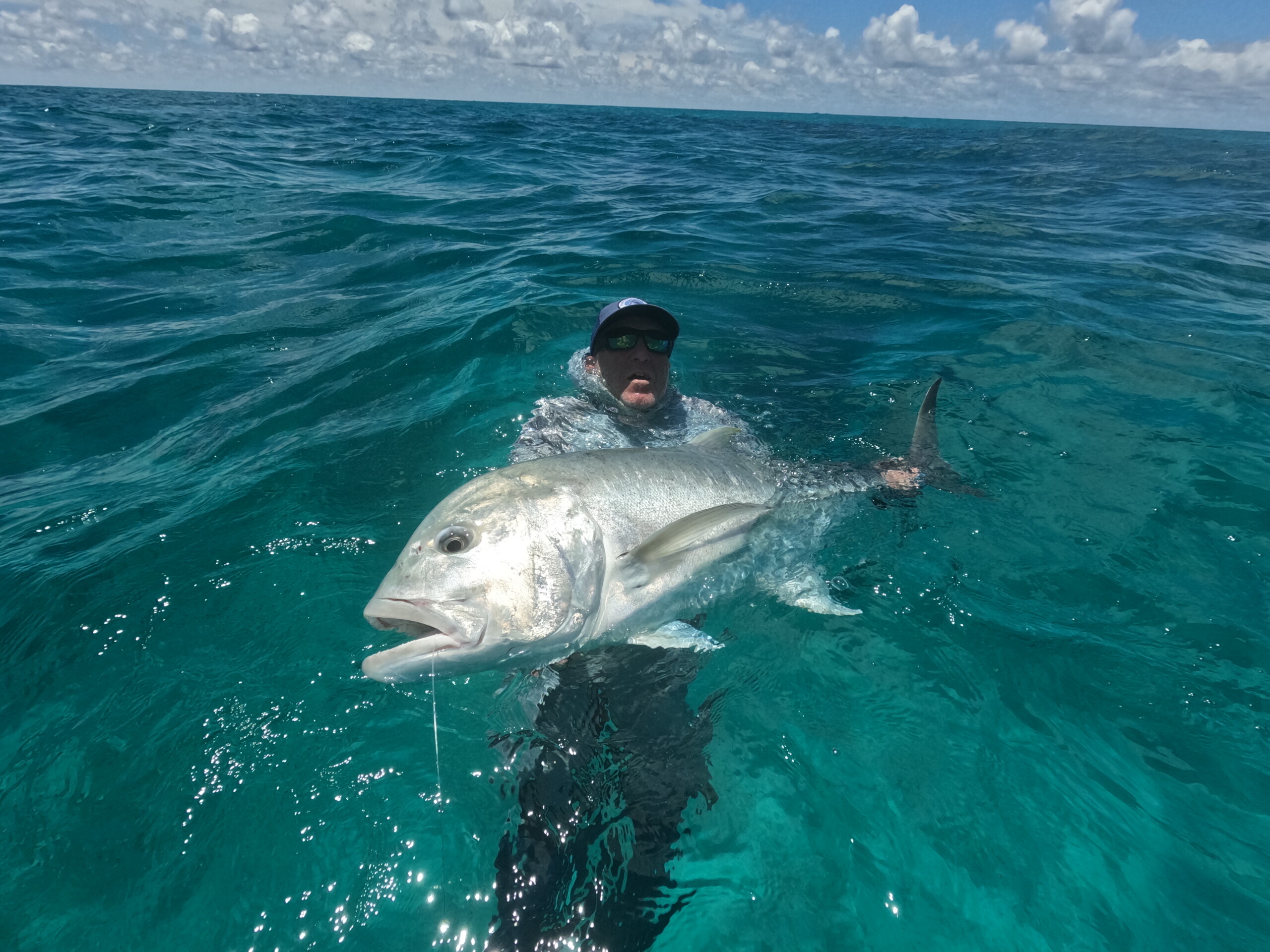 Giant trevally remained a major focus throughout both weeks, producing a long list of firsts, personal bests and dramatic encounters. In the first week, Steve and Greg each landed their first GTs on fly, while William, despite dealing with a potentially broken foot and restricted to boat fishing, managed to land his first GT tailing in ultra-shallow water. Kerr added his first GT on fly in the nick of time on the final day. The second week proved even more productive. Trevor and Martin both landed their first GTs ever, followed by Nicholas and George, who also opened their GT accounts early in the week. George quickly pushed further, landing a powerful 107 cm trophy fish that smashed a fly off the surface. Nick and James joined the first-GT club shortly afterward. Later in the week, Trevor landed a dramatic 113 cm shark-scarred “zombie GT” near a shipwreck, while Roy celebrated his first GT at an impressive 108 cm after a perfect long cast and tense fight over coral. Final-day GTs from Nick and Martin rounded out an exceptional run.